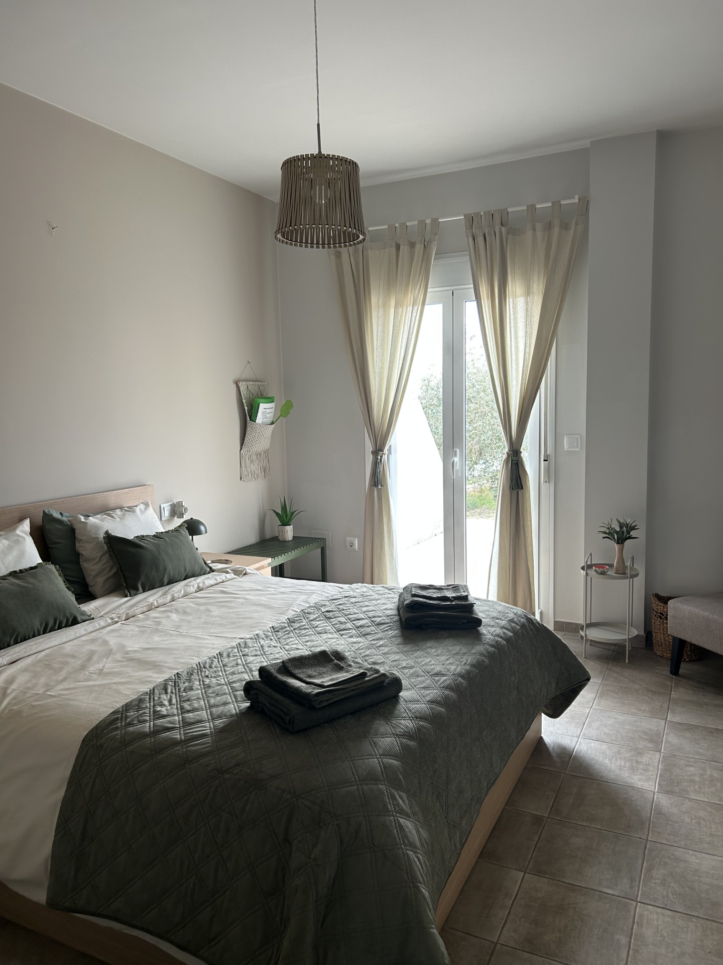 This room has a spacious private terrace. Here you can enjoy in the evening with a glass of wine from the beautiful starry sky. The room has a bed of 160cm x 200cm with comfortable mattress and overlooks the olive grove.