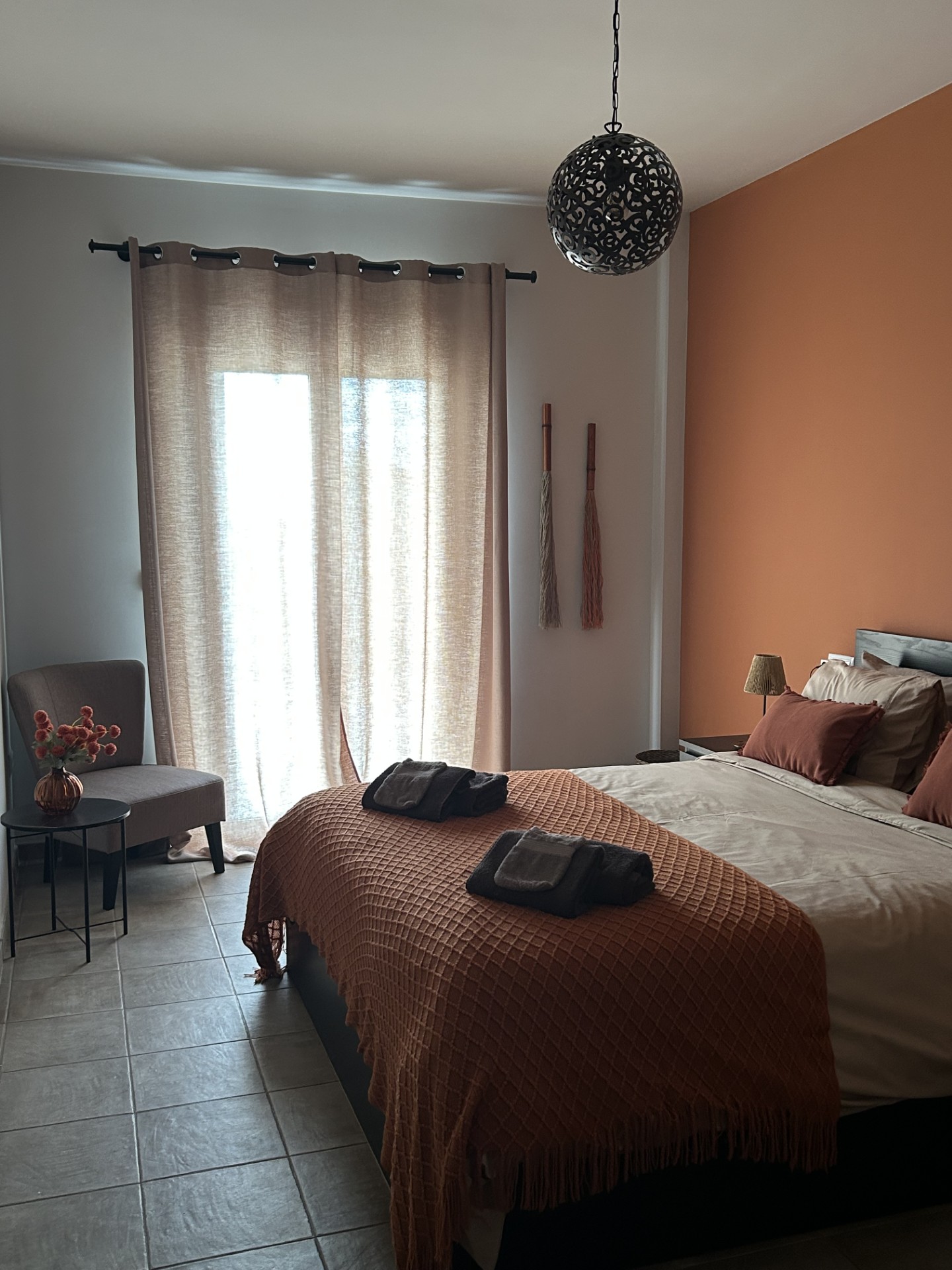 Deze kamer heeft een ruim privé terras. Hier kan je ’s avonds genieten met een glaasje wijn van de prachtige sterrenhemel. De kamer beschikt over een bed van 160cm x 200cm met comfortabele matras en kijkt uit op de olijfgaard.