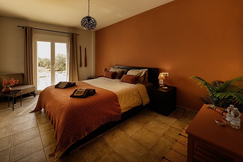 This room has a spacious private terrace. Here you can enjoy in the evening with a glass of wine from the beautiful starry sky. The room has a bed of 160cm x 200cm with comfortable mattress and overlooks the olive grove.